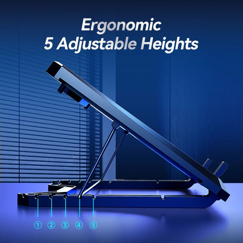 【Ergonomic Design & Anti-slip Baffle】Equipped with ergonomic stand and 5-level height adjustment settings, this portable laptop cooling pad helps you find the most comfortable angle for all-day use whether you're gaming, watching videos, or working. Two non-slip baffles with additional heightening pads for thicker laptops prevent sliding and provide extra stability. It's not just a laptop cooling mat, but also a perfect laptop stand.